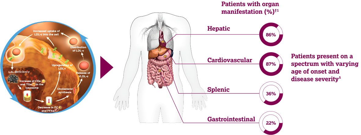 In healthy individuals, LAL processes CEs and TGs as part of cholesterol homeostasis.3 In LAL-D, systemic lysosomal lipid accumulation leads to progressive multisystem organ damage. 1-3