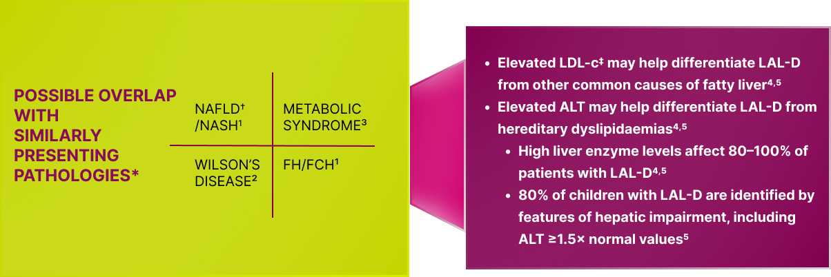 The signs and symptoms of LAL-D can overlap clinically and biochemically with other conditions 1-3